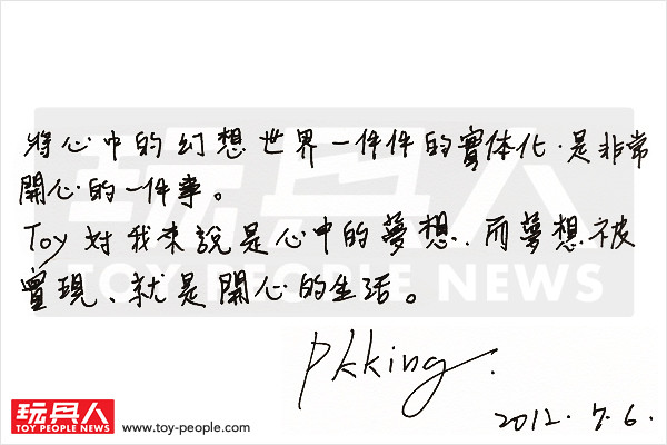 ↓ “將心中的幻想事件一件件的實體化,是非常開心的一件事。玩具對我來說是心中的夢想,而夢想被實現,就是開心的生活。” by Pkking.