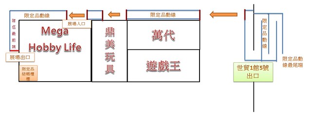 排隊動線:請參照附件圖2,由隊伍最前端開始,沿著我們攤位的外圍,經由鼎美玩具、萬代等攤位後動線沿著5號出口出去,現場會有手持圖3排隊最末端看牌的人員,請依照現場工作人員的指示進行排隊。排隊時請注意自身安全,切勿推擠或有插隊的情形發生。