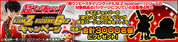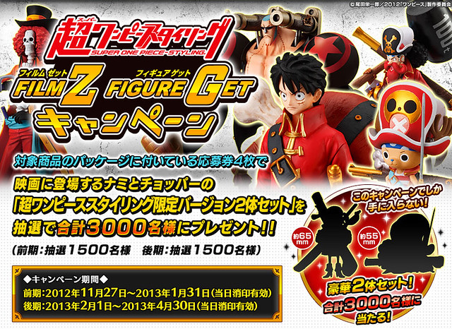 BANDAI 知名的海賊王盒玩系列商品「超ワンピーススタイリング」(SUPER ONE PIECE STYLING),將推出海賊王劇場版~FILM Z special~ 第一彈!將草帽一夥全員在劇場版宣傳海報上的造型立體化!預計將要發售四彈,連續四個月發售!超海賊王STYLING~FILM Z special~ 第一彈將推出:魯夫&喬巴、騙人布、佛朗基以及布魯克。並且只要收集相關商品附贈的應募券4張,即可獲得抽獎,獎品是海賊王劇場版「FILM Z」版本喬巴與娜美組合。(此活動指日本地區)