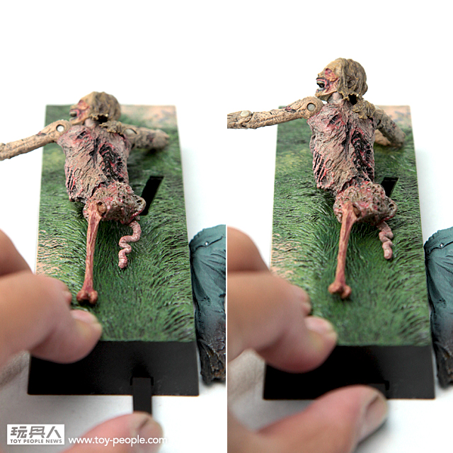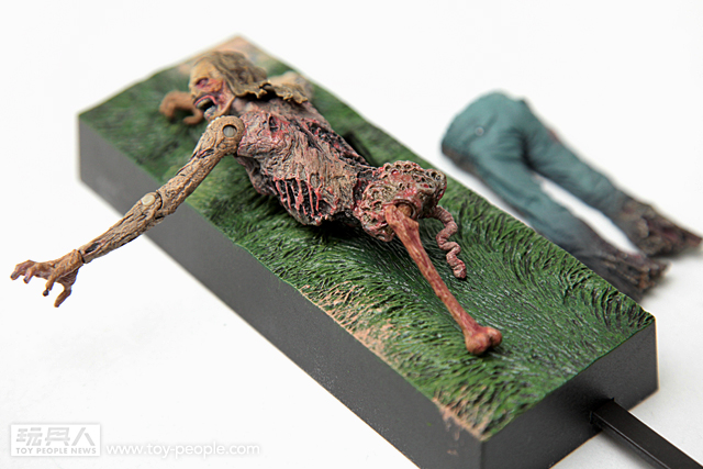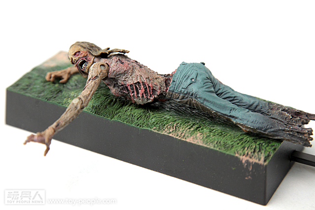 開盒後檢視作品可以看到完成度相當高,特效小組的驚聳造型完美重現,配上草地地台就重現了第一季的經典場景,真不愧是招牌殭屍啊!看過影片應該都知道,這隻殭屍生前雖然是穿牛仔褲沒錯,但實際變成殭屍出現時,早已經沒了下半截。不過仔細一看這牛仔褲製作相當精細、污損血漬十分到位,其實這可是麥法蘭準備給玩家的一大驚喜喔!