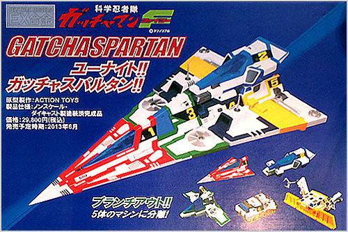 日ART STORM 玩具公司預計在2013年6月販售EX合金系列的科學小飛俠的旋風斯巴達(Gatcha Spartan),在前幾天Wonder Festival2013(冬)玩具展當中以公開實體樣品照片,最近也在玩具雜誌展開首波的宣傳圖片,五機合體的EX合金「旋風斯巴達」商品全長36公分,由於要完美重現合體前後飛行型態,變型的過程需要更替部份零件,售價約29,800元日幣,提供給喜歡科學小飛俠的玩具人參考。