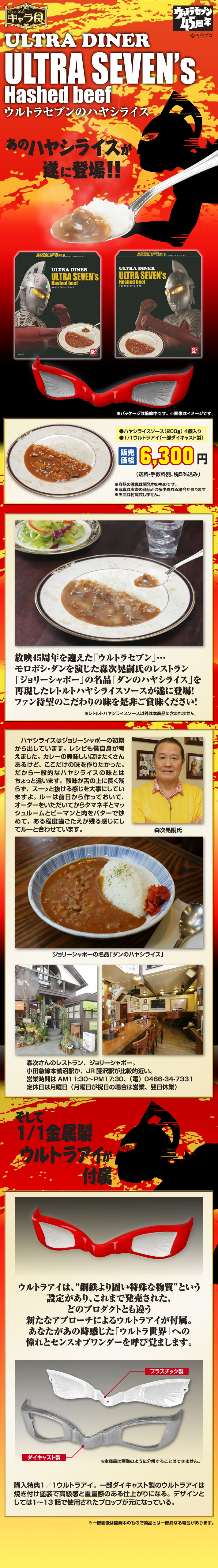 答案是「ULTRA DINER」!這可不是什麼冷笑話,請看看我們介紹的最新產品,真的就是ULTRA SEVEN推薦的特製牛肉飯醬(Hashed beef),商品包裝斗大的標題正寫著「ULTRA DINER」。本商品是由當初飾演變身成ULTRA SEVEN的諸星彈(モロボシ・ダン)一角的名演員森次晃嗣所推薦,姑且不論味道如何,重點是有送一副製作講究的變身眼鏡啊!!!(謎之聲:重點不是ULTRA DINER?)總之官方介紹這是第一彈,看來如果賣的不錯,什麼冠上ULTRA的食品可會讓你吃不完啊!想知道味道如何嗎?本商品日幣參考售價約6300日圓,預計6月上旬推出,提供大家參考!