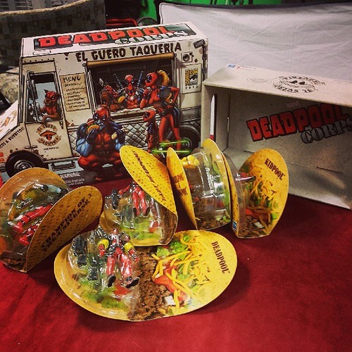 為了迎接2013 年SDCC 的到來,孩之寶公司(Hasbro)推出了一款「死侍兵團」的經典組合包,由旗下當前最火紅的Marvel Universe 3.75 吋產品線來推出,以墨西哥捲餅的販賣車最為包裝盒的設計,而裡面的吊卡則採用墨西哥捲餅的背卡,如此的設計真的太經典了啦!