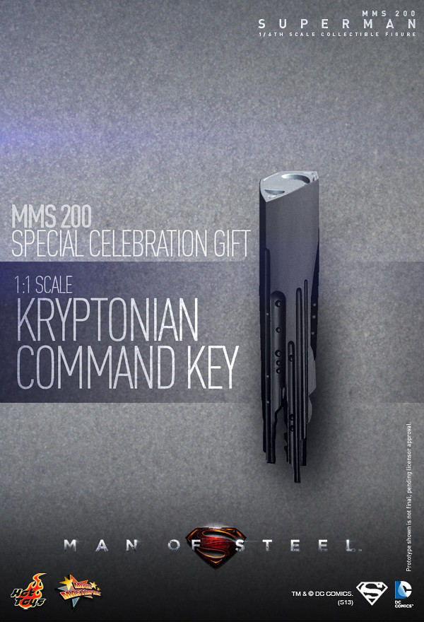這次Hot Toys 所推出的超人作品,除了採用電影中新造型的超人造型之外,頭雕也有別於過去超人帥氣的頭雕,而採用了經典的超人憂鬱表情。而這次的超人素體似乎也採用了強壯素體,完美了呈現了在電影中的超人的壯碩感。此外,為了紀念這個具有意義的第200 號Hot Toys 作品,Hot Toys 公司也附送了一個1:1 的Kryptonian Command Key。相信這也是為了召喚Hot Toys 的第201 號作品吧!