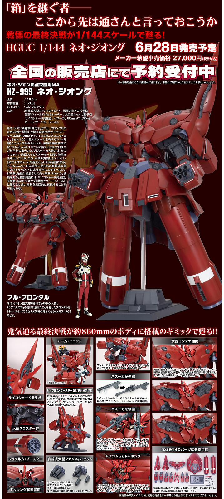 隨著《機動戰士鋼彈UC》完結篇『機動戰士鋼彈UC episode 7 -彩虹的彼端-』的上映,劇情中登場的新機體也一一登場!~ 其中在最終決戰,以驚人的超巨型尺寸魄力震攝全場的新吉翁最終兵器「新吉翁克」也將推出1/144 鋼普拉。