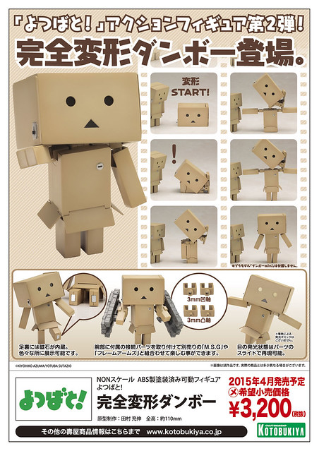 2014年10月9日新增官網公開宣傳照片和完全變形的影片介紹,完全変形ダンボー よつばと!這次完全變形紙箱阿楞腳底有磁石裝置,眼部需變換配件來呈現發光的模樣,尺寸高約有11公分,發行售價約3,200元日幣,有興趣的玩具人可以參考一下下方短片,喜愛阿愣紙箱機器人的玩具人千萬別錯過囉。
