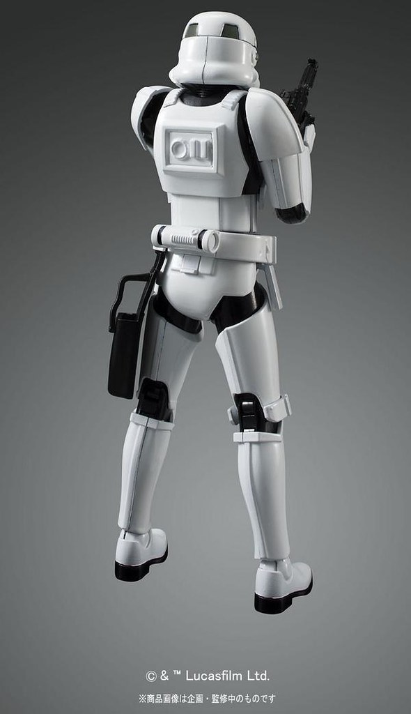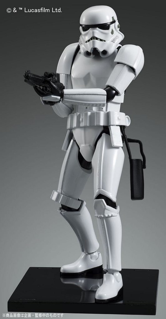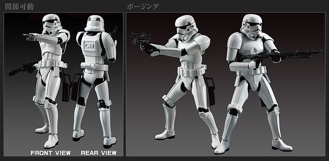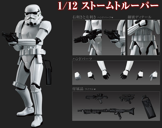 隨著『黑武士 - 達斯‧維德』於12月登場的,是象徵著帝國勢力、許多星戰迷們最愛大量收藏來閱兵的『帝國風暴兵』(白兵/Stormtrooper)。這一款1/12 比例組裝模型版「帝國風暴兵」,將可藉由手部替換零件,來重現原作中白兵左撇子/右撇子(複製人/非複製人)的差異,並且可藉由可動關節重現多種不同經典的姿勢。除此之外,也與「黑武士-達斯‧維德」相同,附屬了死星地板造型的地台,能夠一同展示陳列。並且有三種不同形式的武器可供自由替換。