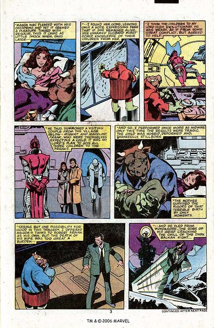 Magda隨後來到Wundagore山,向研究人類進化的High Evolutionary求助。High Evolutionary 所造的牛獸人 Bova 為 Magda 接生,產下 Pietro(皮特羅)和 Wadna(汪達)這對雙胞胎後,Magda 不希望丈夫知道孩子存在而跑到風雪中,自此下落不明。Bova 本來想把兩個嬰孩交給當時另一對正向High Evolutionary求助的 Whizzer以及 Miss America 這兩位二戰超級英雄夫妻,並想揚稱是兩人的孩子,但 Miss America 的死早讓 Whizzer 難過到離開。
