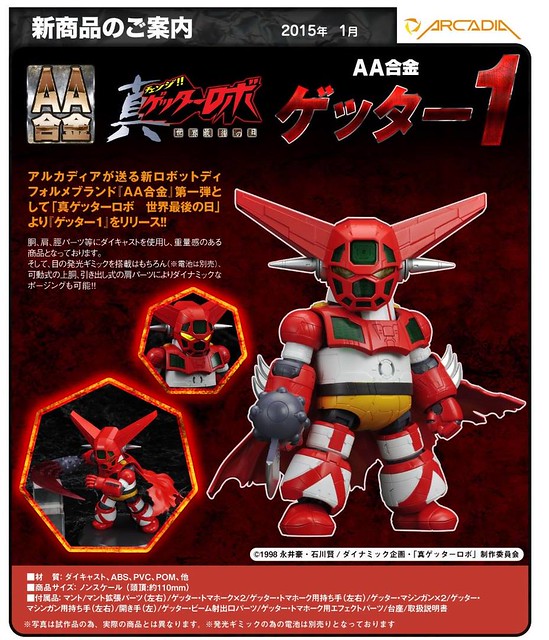 來自ARCADIA玩具公司預計2015年5月推出AA合金系列 真ゲッターロボ 世界最後の日 ゲッター1 『真蓋特機器人 世界最後之日』蓋特1號(暫時翻譯),永井豪老師自1974年繪製『ゲッターロボ 蓋特機器人』到現在已經40多年了,這次將以AA合金新系列商品來呈現蓋特1號。