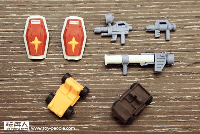▼ 最後一款是「連邦軍武器組」!入手了RX-78-2 一定也要入手這組,武裝一下你的鋼彈啊! 武器相當豪華地收錄了兩面盾牌、超級火箭筒、光束步槍以及光束噴射槍。除了豐富的武器之外,還附有兩款劇中登場的全地型車。