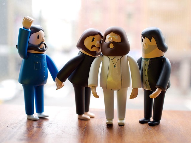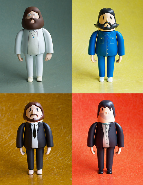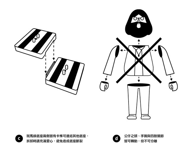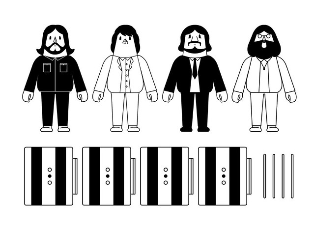 The BITOY將四人以幾何的方式重新塑造,讓頭部與四肢都擁有靈活的軸關節;底座則採用斑馬線造型,短支架可讓雙腳直立,也可以使用長支架,讓公仔邁開腳步、重現經典場景,能夠把玩也能展示兩相宜!