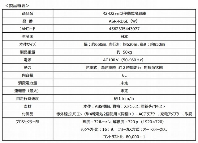 2015年10月29日新增宣傳照片和販售資訊,近日AQUA官網公開了開始接受訂購的網頁,首波還推出免運費的優惠,預定2015年12月中旬起陸續出貨,不過目前以日本國内製造的完全受注販售方式,喜歡這台R2-D2 1:1 可以行走式的冷藏冰箱可要麻煩一下日本友人了,對《星際大戰》系列有興趣的玩具人千萬別錯過了歐!