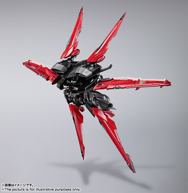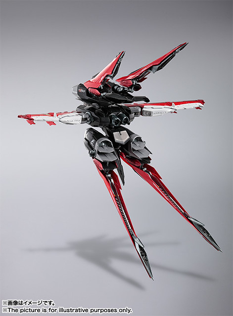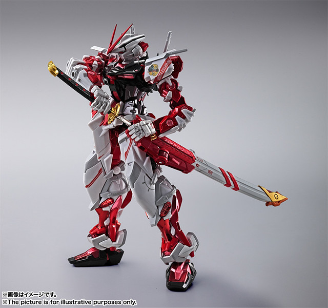 這次的作品,重點在於金屬關節與聚碳酸酯材質的外裝,打造出市面上最棒、最高級的異端鋼彈紅色機。鋅合金材質的部分鍍上特殊的電解塗層,白色裝甲則使用聚碳酸酯材質。藉此讓造型發揮出鋅合金的紅色銀輝光澤,以及帶有光澤的白色,將造型昇華至全新領域。並請到了知名的機械設計師阿久津潤一重新繪製METAL BUILD 系列的造型。除了特殊製作的關節、素材,加上大師所打造的外型之外,全身上下還施以了許多細緻的裝飾,讓造型完整度更加提升。