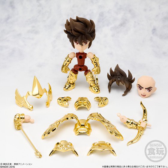 身上的聖衣是使用電鍍加工來製作,全身配置有多處可動關節,此次還特別集結三位原型師來負責整個系列作品,以「原川光博」老師執行主要系列的原型、「大畠雅人」是其3D造型與「南田香名」負責顏部的造型等等,不會因為是小尺寸的食玩而忽略掉了整體風格的平衡,每款都有附兩款不同表情的顏部配件可以替換,和不同姿勢的手臂零件等等豐富配件。