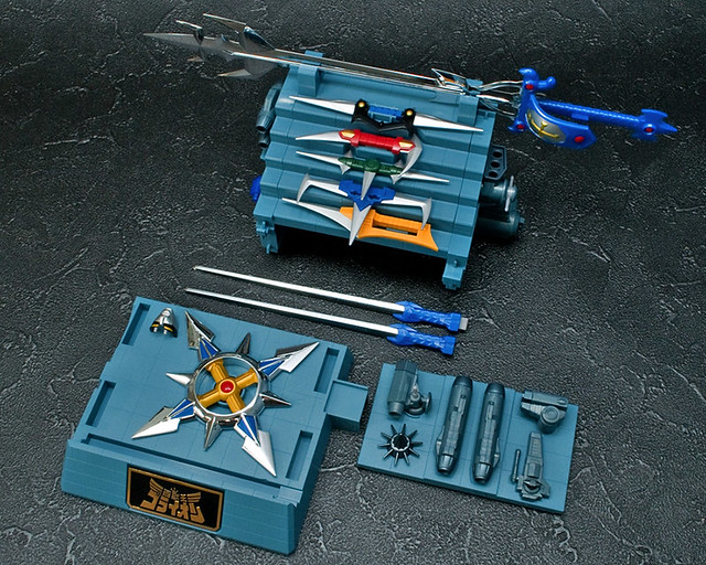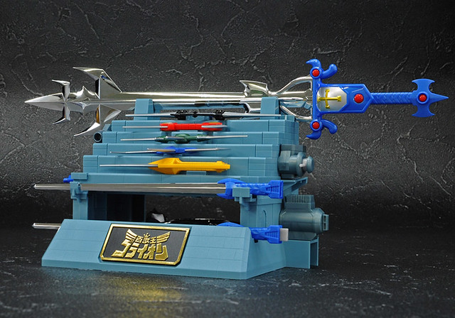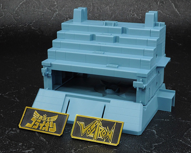 底層收納防護盾及獅子們所用的火炮武器,階梯上則是收納著獅子們嘴巴所使用的刀、劍型的配件等等,還有兩種規格的展示牌一款是日文"百獸王"字樣,另一款是"VOLTRON"的英文字樣顯示照顧海外玩家的貼心設計,這次是先行公開"前篇"的部份來吊吊玩具人渴望的內心啊(淚),接下來的"後篇"的變型合體部份一定有更大的攻擊力啊!!