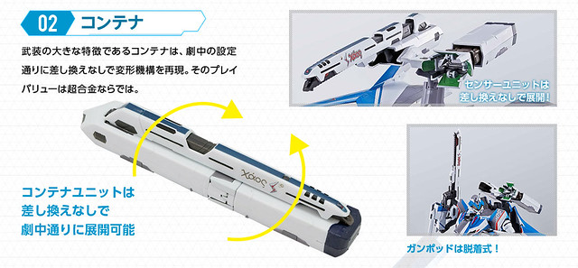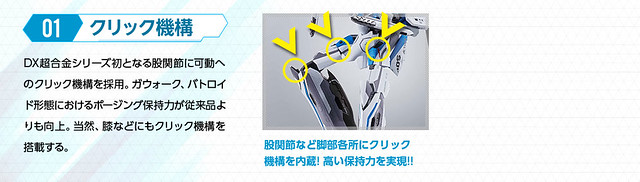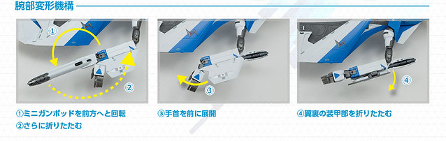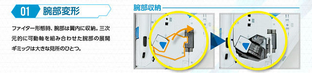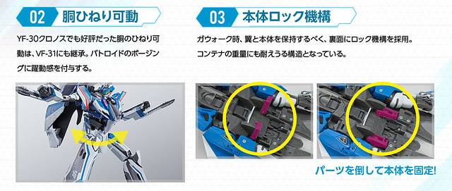 「DX超合金 VF-31J 齊格菲(疾風·因梅爾曼機)」在外型上沒話說,十分帥氣。最重要的變形結構則主打以全新技術來詮釋「三段變形」構造,不僅腕部可以完全收納於機翼中,收納武裝的貨櫃也不需更換零件,可以直接展開。機體結構上,股關節部份新增了兼具可動與強度的棘輪機構。腰部繼承了先前發售的YF-30的可動,另外也設置了鎖定機構,能增加變形時的強度。