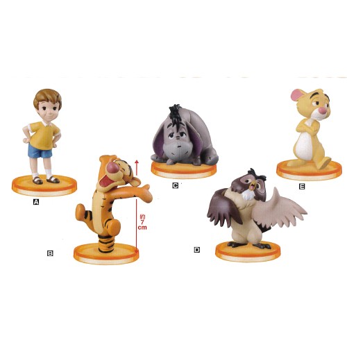 將會收錄劇中所出現的主要角色有小男孩 克里斯多福.羅賓(Christopher Robin)、跳跳虎(Tigger)、驢子 屹耳(Eeyore)、瑞比(Rabbit)、貓頭鷹(Owl)等等五種,另外小熊維尼(Winnie the Pooh)與小豬(Piglet)是會收錄在較大尺寸的「MEGA」WCF系列裡面,附有一個大原木的底座,可以讓眾多角色集合起來構成場景的模樣,喜歡《小熊維尼》的玩具人千萬別錯過了歐!