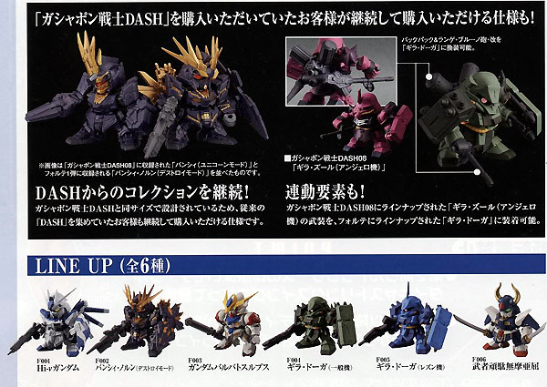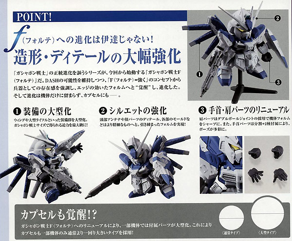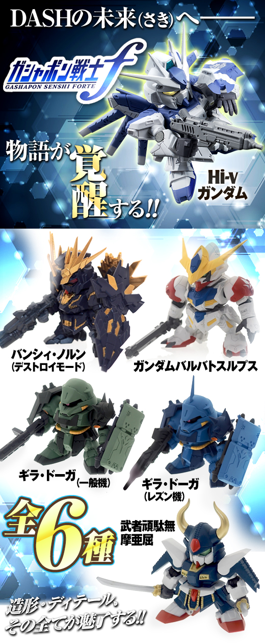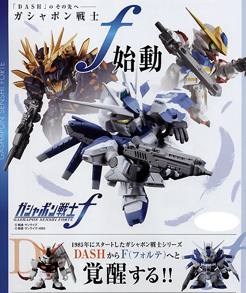 日Bandai萬代玩具公司的轉蛋事業部門其"轉蛋戰士(ガシャポン戦士)"系列十分受好評,這次將以"非常"的嶄新系列「F(フォルテ)=強く」(名稱暫譯)來推出!強調機體的"武裝大型化"以及手首可以替換、或是機體的新可動關節的進化等等,這次將收錄在逆襲的夏亞小說版《貝爾德琪嘉的子嗣》中登場的「Hi-v鋼彈(Hi-vガンダム)」雖然並沒有在動畫作品中登場,但卻在鋼彈迷中有著極高的人氣,以及《機動戰士鋼彈:獨角獸鋼彈》系列作裡面的2號機「報喪女妖(毀滅模式)バンシィ・ノルン(デストロイモード)」。