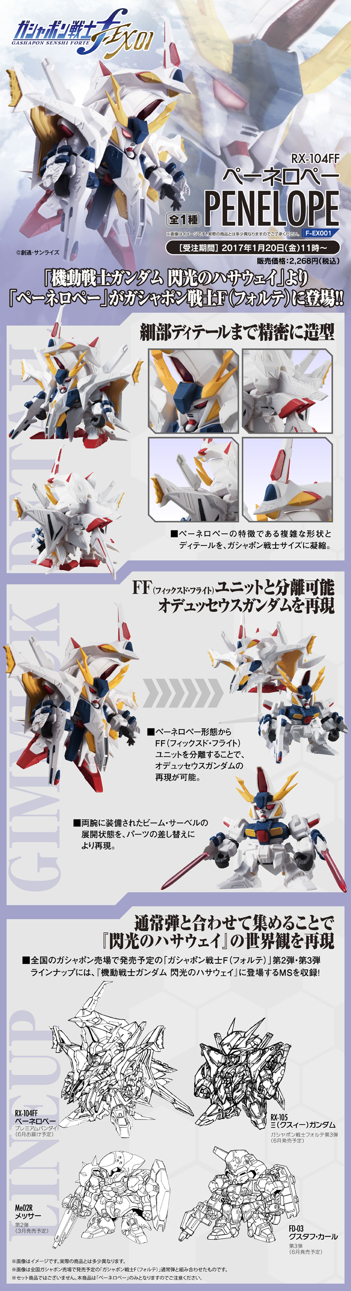 日Bandai萬代玩具公司的轉蛋事業部門其"轉蛋戰士(ガシャポン戦士)"系列十分受好評,將以"非常"的嶄新系列「F(フォルテ)=強く」(名稱暫譯)來推出!強調機體的"武裝大型化"以及手首可以替換、或是機體的新可動關節的進化等等,首波已經公開「第一彈」預計收錄的六種機體後,將繼續於魂web線上商店推出"特別彈(EX01)"《機動戰士鋼彈:閃光的哈薩威》當中特殊的機體「潘尼洛普(ペーネロペー)」!