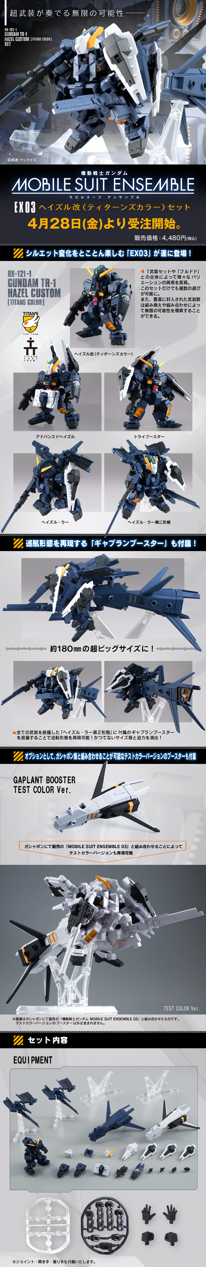 "MOBILE SUITE ENSEMBLE 系列"以機體全身上有著相同的組合插孔與凹槽(約3mm)的設計,讓機體的武裝與結構可以任意組合,並且讓機體改裝有著無限的可能性,這次當然也利用這種"可以任意組合的結構"把《ADVANCE OF Ζ 迪坦斯的旗下(ADVANCE OF Ζ ティターンズの旗のもとに) 》中ガンダムTR-1[海茲爾改(ヘイズル改)]泰坦配色的機體呈現,多款豐富的裝甲以及支援推進器等等都可以配置在海茲爾改的機體上,另外還附有第三彈"海茲爾改"機體較淺配色的裝配歐!喜愛《機動戰士鋼彈》系列的玩具人可以參考一下歐!