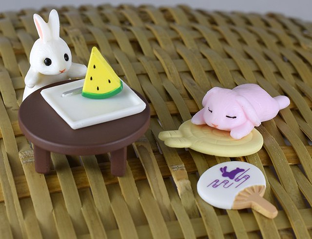 推出多款趣味動物轉蛋作品的Epoch(),之前以可愛的"兔子"為題材已經推出過「日式和菓子兔」、「兔兔洋菓子本舗」、「搗麻糬兔」、「回萌兔」、「散歩小兔」、「靴子胖小兔」和「兔子的自由時間」等等多款轉蛋的商品,這個月份將繼續推出十分療癒的「納涼小兔(納涼うさぎ)」(名稱暫譯)系列的轉蛋續作品。