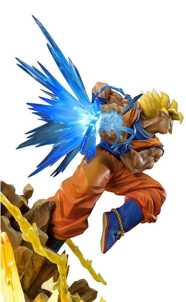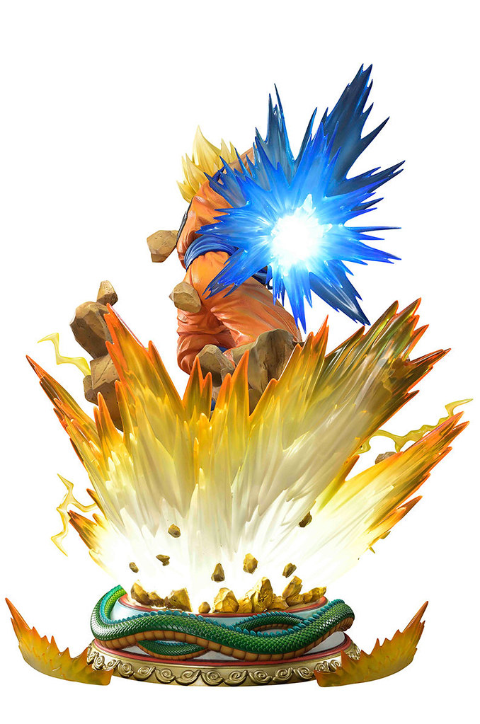 「MEGA PREMIUM MASTERLINE 孫悟空(超級賽亞人)1/4比例雕像」使用悟空的令人印象深刻的超級賽亞人型態、準備使用龜派氣功的魄力姿態。悟空本體再現了原作中銳利的線條、壯碩的肌肉以及表現傷痕的筆觸,躍動的姿勢配合底座迸發的碎岩、氣場,神龍與四星球更連結了悟空的故事背景。雕像內更藏有 LED 點燈裝置,從龜派氣功與底座的氣之中發出光芒,展示起來更過癮!