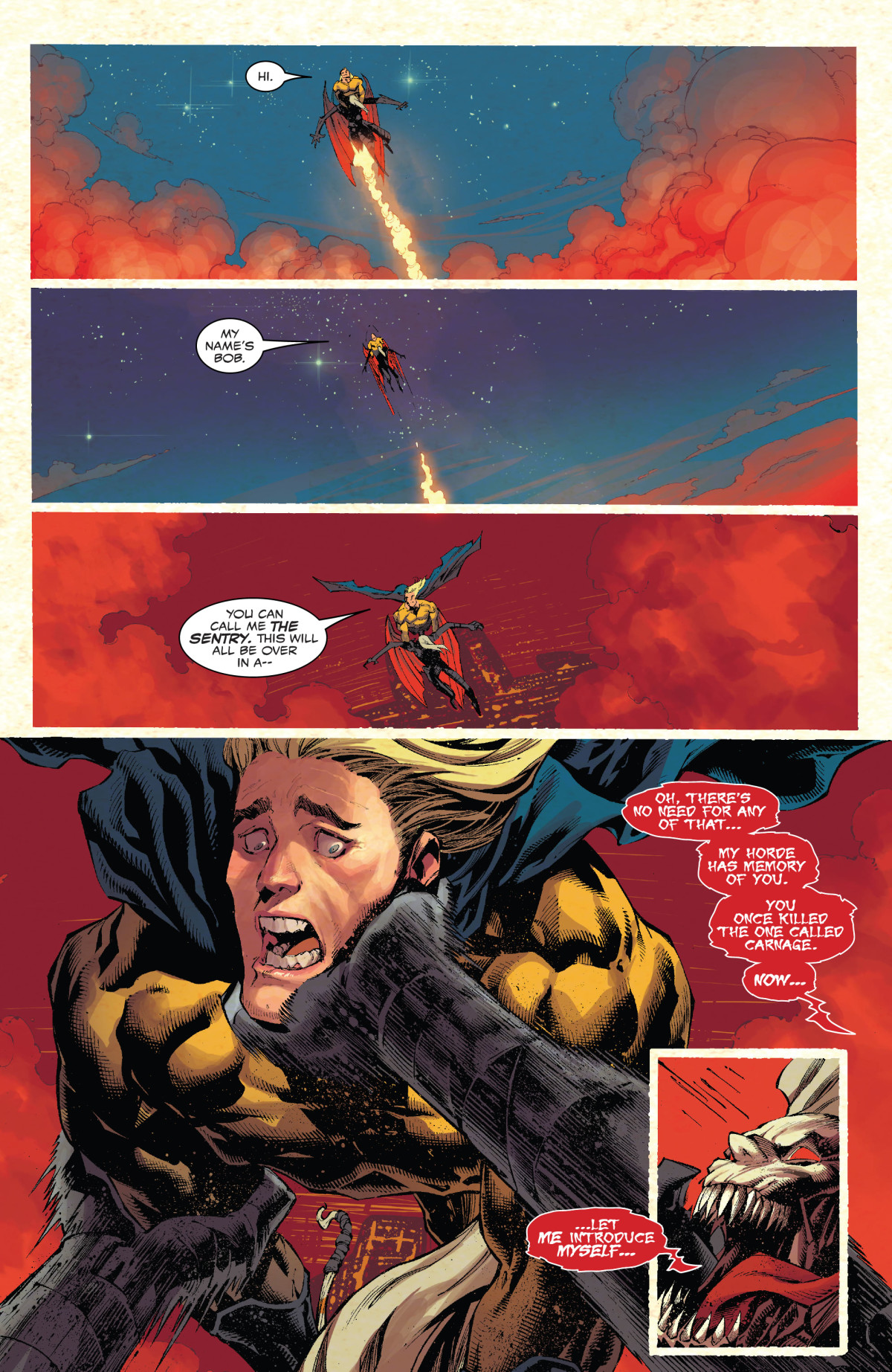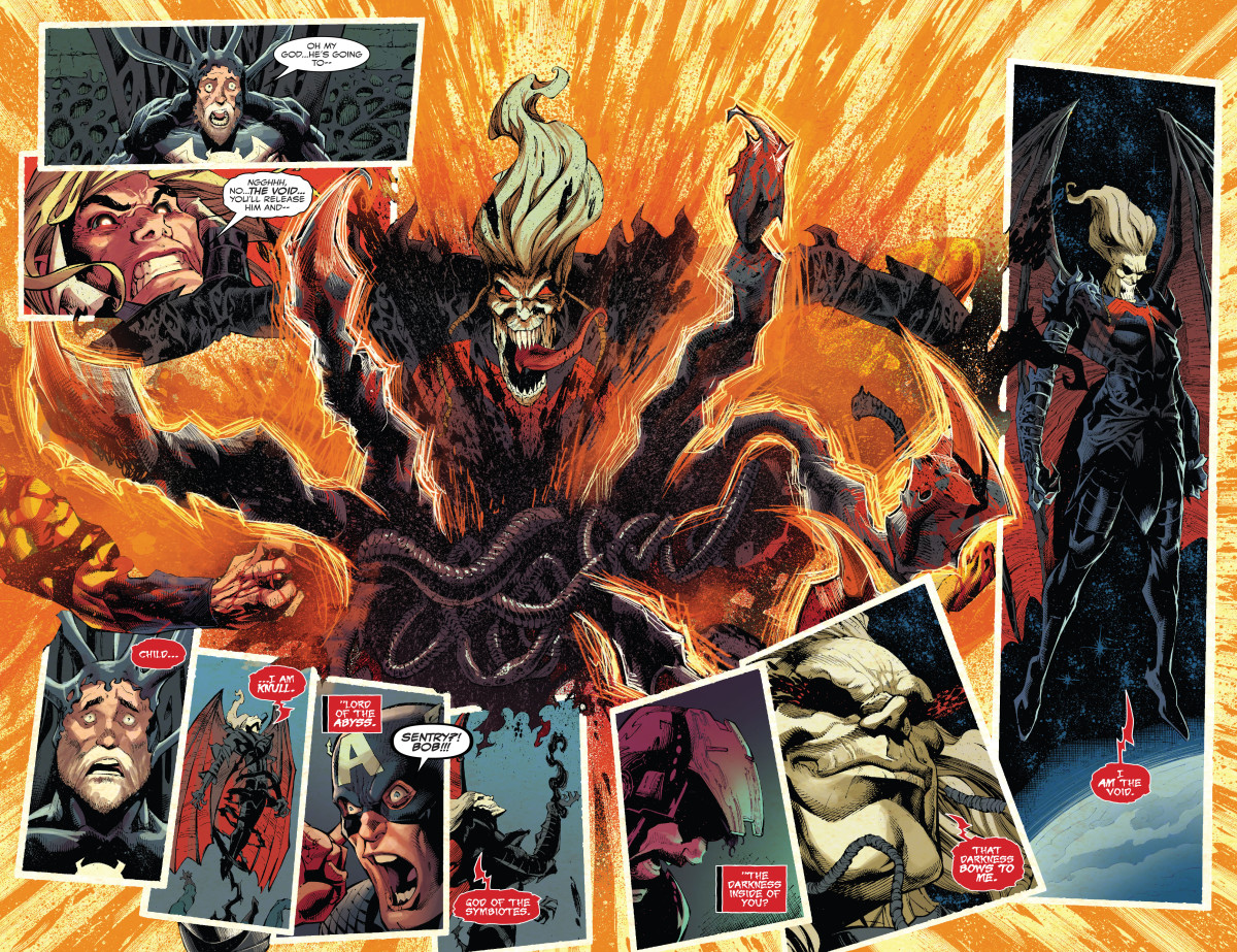 在共生體之神納爾殺到地球時,全世界的超級英雄都挺身而出對抗他的大軍。而恢復了一般型態、回到地球的哨兵則是直搗黃龍,摧毀了納爾所持有的天神族(Celestials)屍體,並打算直接將他扯成兩半。沒想到哨兵的力量居然落於下風,反而反過來被納爾撕成碎片,虛無甚至被納爾給吸收、吞噬下去,因為他本來就是虛空與深淵之神。