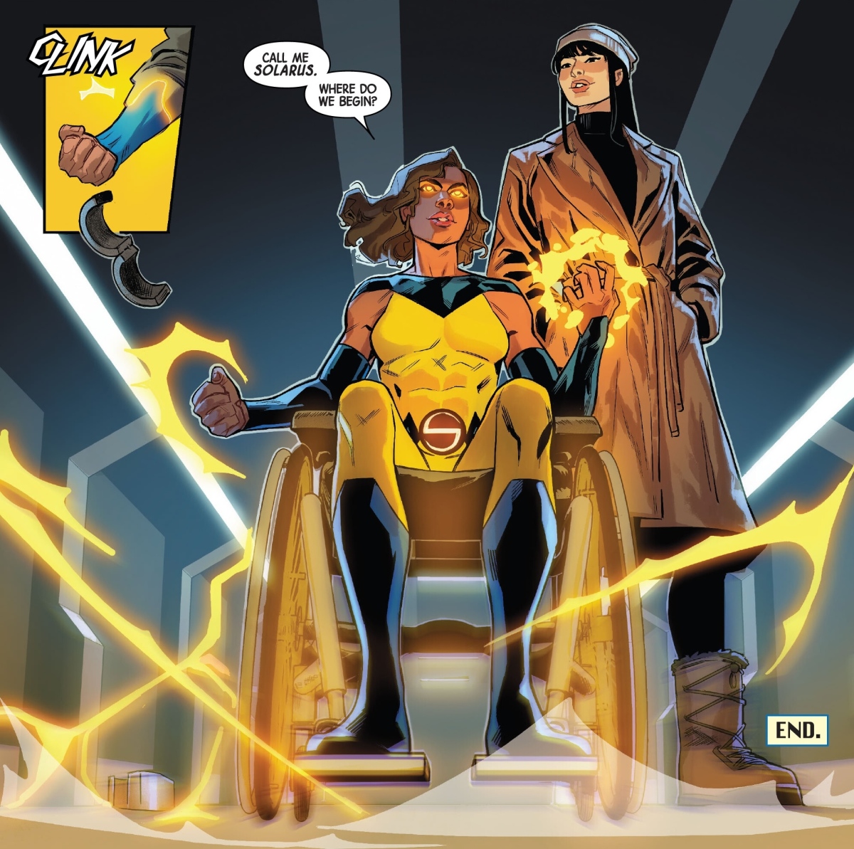 其中,青年Ryan Topper在搞清楚這些力量的來源後開始獵殺其他「哨兵」們並吸收他們體內的超能力,唯獨放過了似乎不成威脅的半身不遂的記者Mallory Gibbs。自大又殘暴的Ryan試圖加入復仇者不成,最後更被召喚出四位哨兵亡魂的Mallory擊敗,哨兵的力量全部集合到了她身上。目前她自稱Solarus,並在警探迷霧騎士(Misty Knight)的指導下開始學習成為一位超級英雄。
