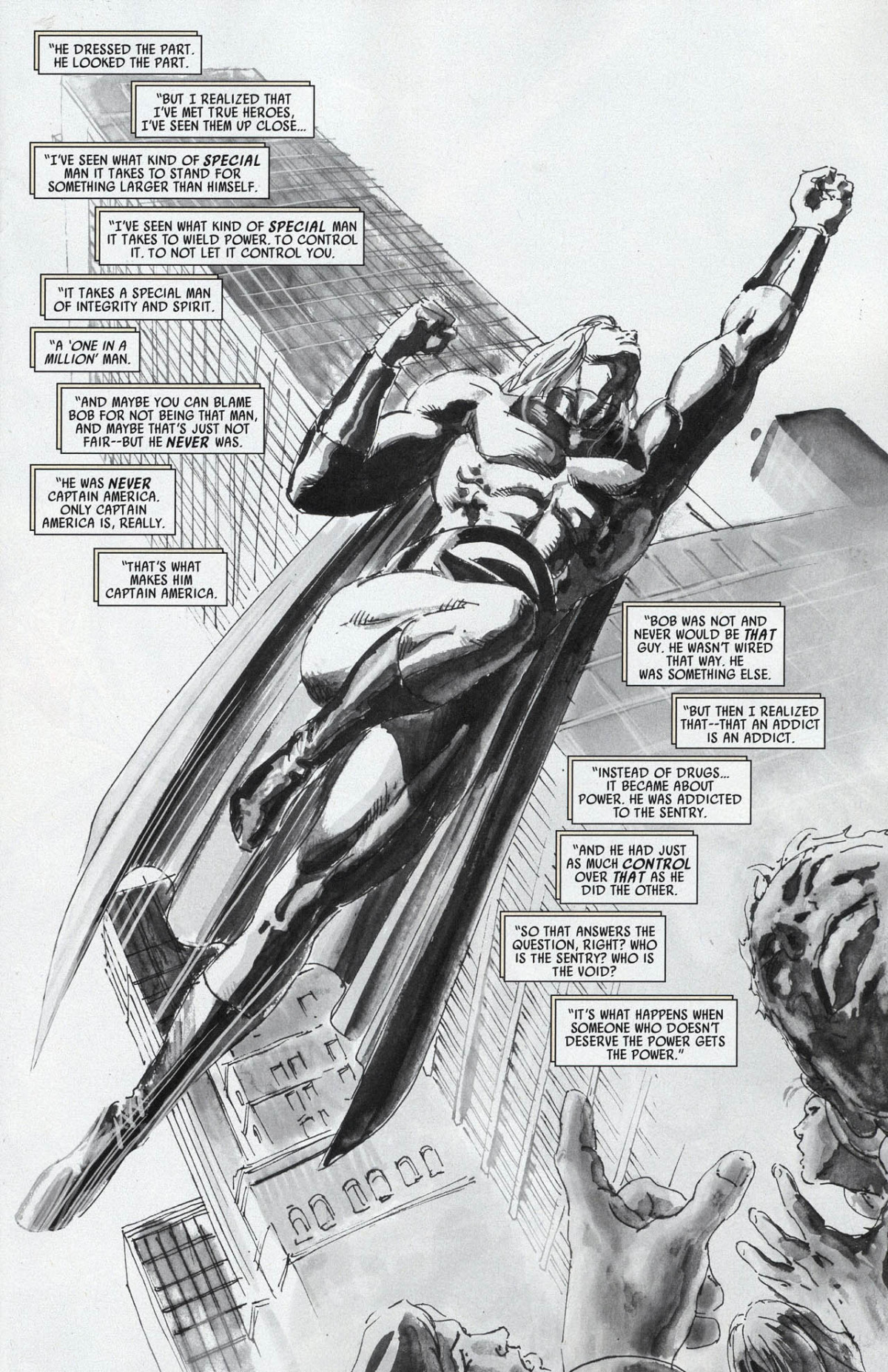 虛無搶去他身體的使用權,屠殺了曼哈頓上百萬的居民、差點殺死Scout,還引發浩克的暴走。為了阻止他心裡的怪物繼續傷害人類,哨兵與神奇先生和奇異博士(Doctor Strange)兩人合作開發了一個方式,讓整個世界都忘記哨兵的存在,包括羅伯特自己。哨兵消失了,因此虛無也無法成為人類的威脅,地球暫時安全了。