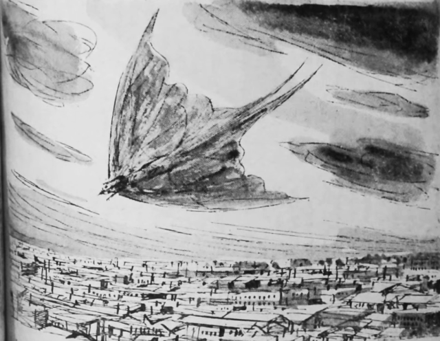 在最初的小說版発光妖精とモスラ中,摩斯拉的造型設計像是一隻燕子,