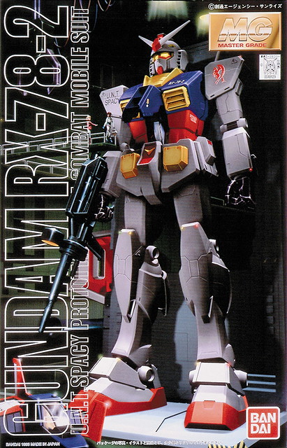 史上第一款MG,毫無例外的還是初代鋼彈RX-78-2,1:100的比例,高度大約18公分左右,和動畫中的簡單線條相比,造型更銳利、機械感更強烈、整體風格更接近真實存在的新銳武器。