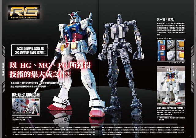 PG 無限美,但是高貴無比、體積太大不易收藏,最重要的是,一般人很難從組裝、打磨、噴灰、塗裝上色、入墨線到上保護漆,全部獨立製作完成。如果能夠兼具PG 的規格水準、尺寸卻只有HG 大小,價格又比MG 更實惠,那不就太理想了嗎?你的願望鋼普拉大神聽見了。這是真的,是真的,是真的。願望講三次就會實現。REAL,REAL,REAL,於是2010年,鋼普拉30週年的時候,全新REAL GRADE 誕生了。這是鋼普拉第4個G,集合了HG、MG、PG 的技術精髓,終於創造出洋溢著終極真實感的RG 真實等級。