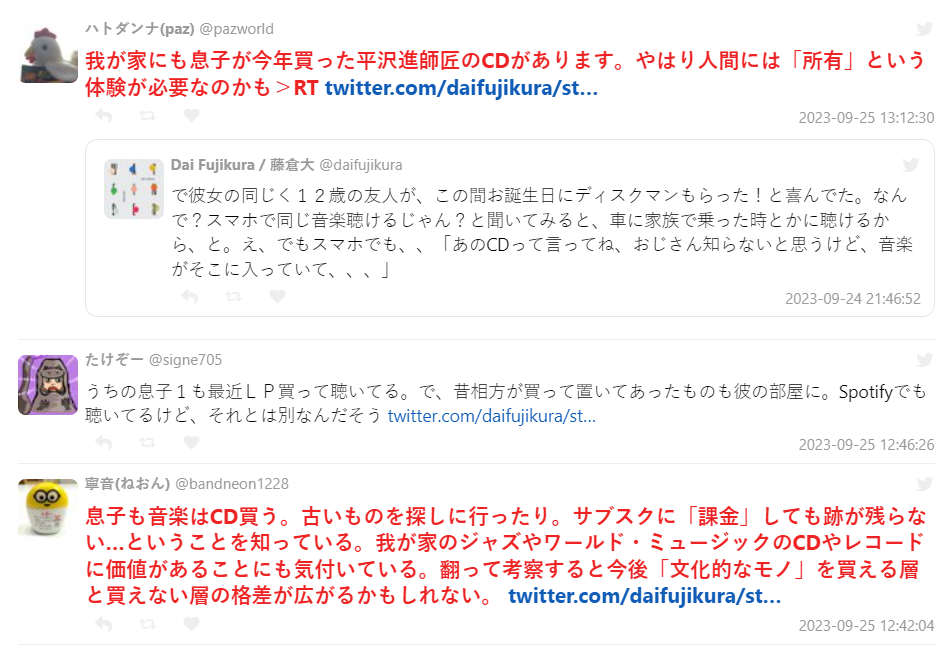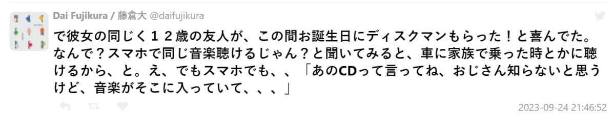 藤倉大也好奇問女兒,為何現在你們會想要收藏黑膠或是 CD,女兒回答是 : 「aesthetic」( 美學或審美 ),或許大家真的拿來聽的不多,但有這樣的收藏就可以展現自己的審美價值,現在朋友間也會秀自己的收藏,也可以作為追星的採買物,或許哪天實體唱片又會捲土重來也說不定 XD。