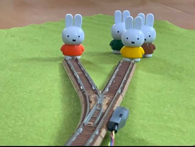 推特一名網友B作(@Btoretsukuru)試著重現了電車難題,將人改為米菲兔,一樣的問題形式,一樣的解題法,只是他做出了與常人不一樣的解法,而這解法竟能同時救到兩條路線上的米菲兔!那就是...「雙軌甩尾」!推主利用控制器讓電車急煞車的同時做出甩尾的高難度動作,讓電車在兩條鐵軌上橫置停下,這樣不僅救到了米菲兔,也解決了倫理困境。