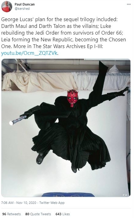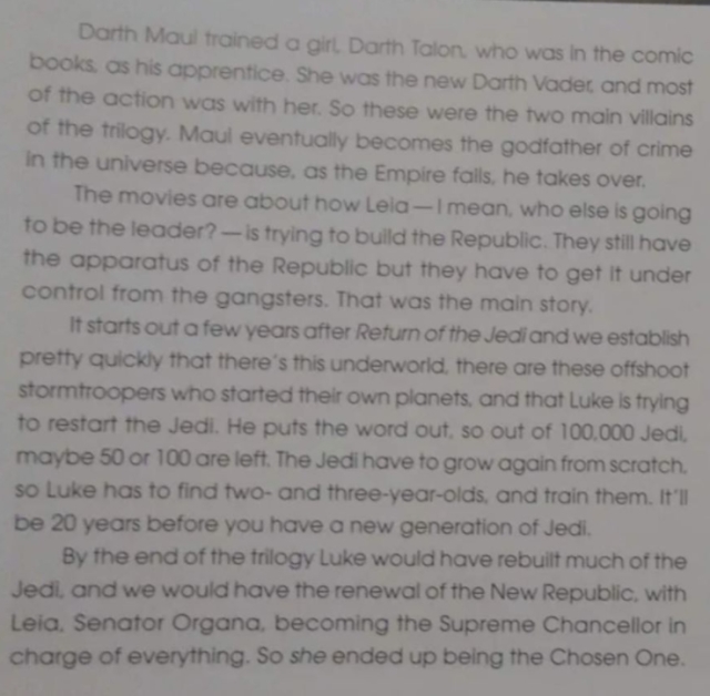 「喬治盧卡斯對於後傳三部曲的計畫包括:以達斯魔(Darth Maul)與達斯塔隆(Darth Talon)為反派、路克與逃過密令 66 的生還者們重建絕地組織、莉亞重建新共和國,並成為『預言中的那個人』(The Chosen One)。」