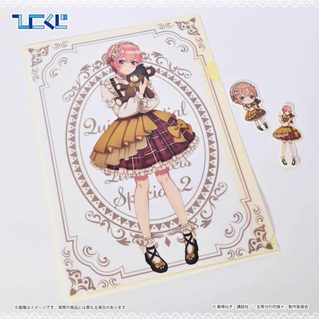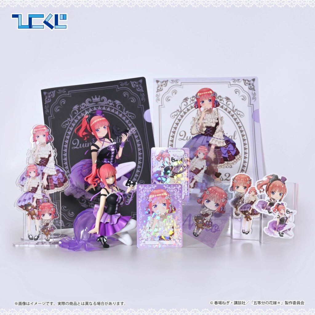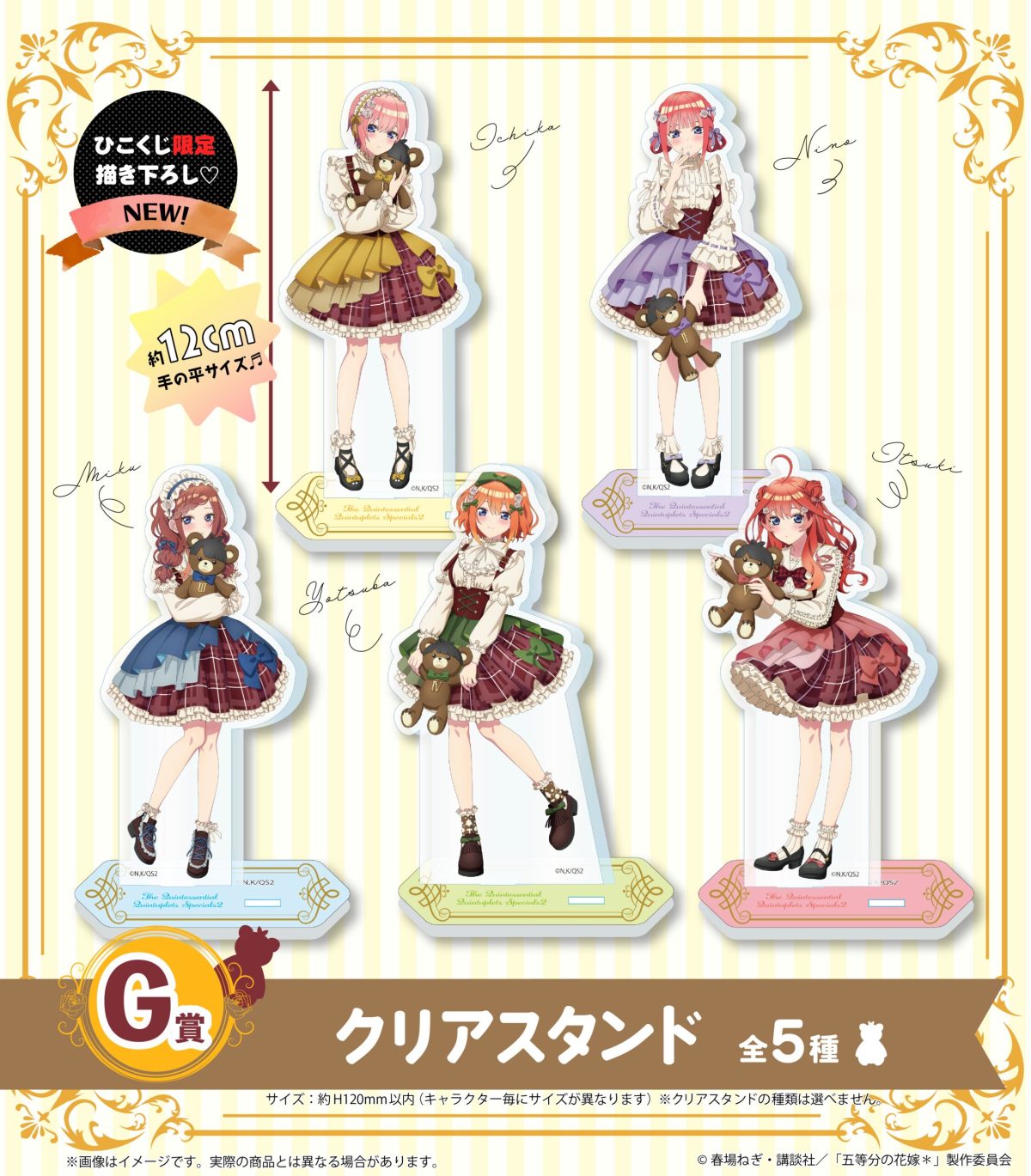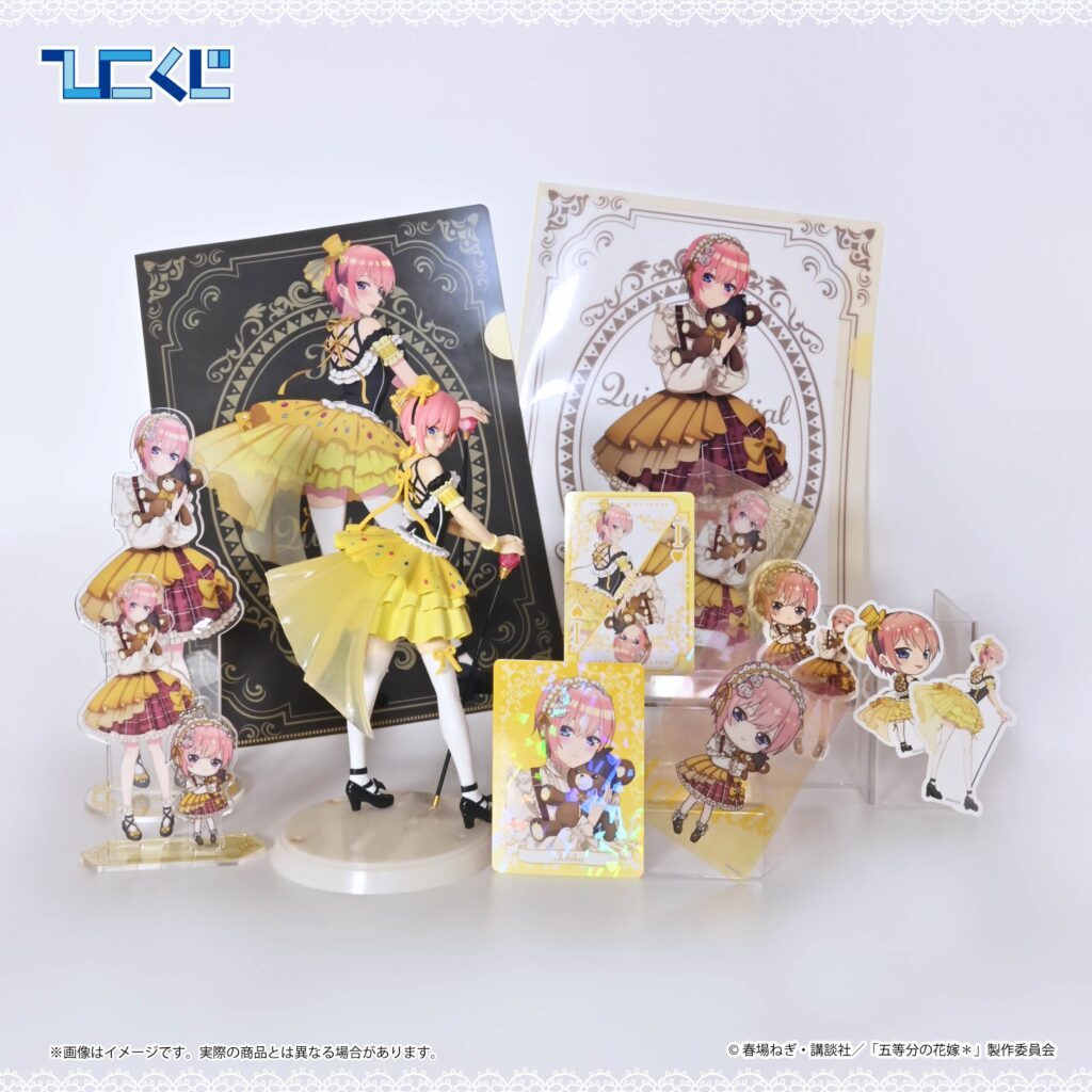 「HIKO賞 五等分的新娘*~你喜歡哪一個我?~」,採用原創插圖「Masquerade Party」主題,將其製成A~E賞的五胞胎角色模型!其餘獎品則是「經典蘿莉塔」風格,同樣也是使用新繪製原創插畫,推出夢幻的壓克力立牌、透明文件夾和貼紙、Q版吊飾、卡片套組以及最後賞的A3透明插畫板...等豐富獎品!