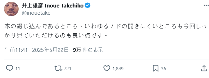 井上雄彥老師除了在貼文中提到:「6月2日起,《灌籃高手》也可以用數位版閱讀囉。」他還補充了一段創作小故事:「順帶一提,我的原稿是畫在 B4 尺寸的肯特紙上,如果是跨頁大場面,就會用橫放的 B3 紙來畫。當年連載時只有紙本書,所以畫面構圖是以雙頁來設計的,現在如果用比較大的平板閱讀,雙頁展開起來會最接近當時的原稿呈現,閱讀體驗也會比較好。」