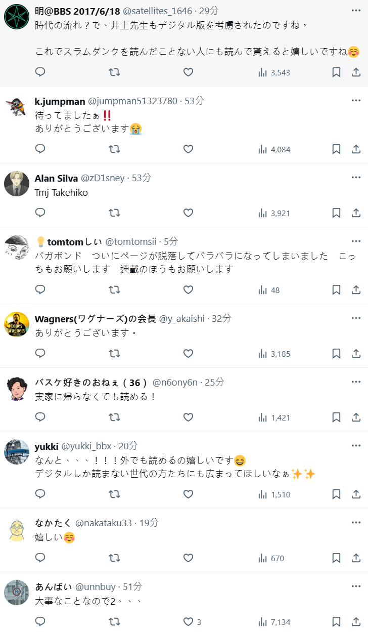 這次《灌籃高手》的數位化可說是讓人感到驚喜,不少粉絲興奮留言:「這就是我一直在等的啊!!太感謝了!」、「隨著時代演進,終於井上老師也考慮數位化了!」、「終於來了嗚嗚嗚」、「以後隨時隨地都能看啦!」