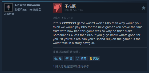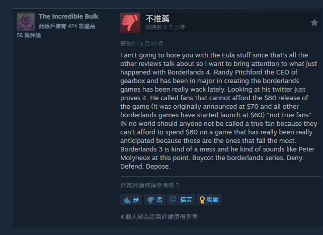 事態迅速升溫,Pitchford 隨後試圖澄清言論、挽救公關危機,但反而讓不少粉絲感到火上加油。不僅如此,這場爭議也蔓延至系列舊作,包括《邊緣禁地2》(Borderlands 2)與《邊緣禁地3》(Borderlands 3)在內的多款作品,近期在 Steam 等平台接連遭遇「灌負評」現象,顯示玩家不滿情緒已擴散至整個品牌。