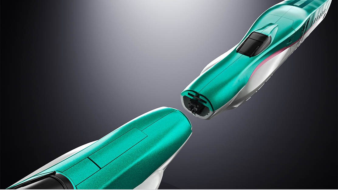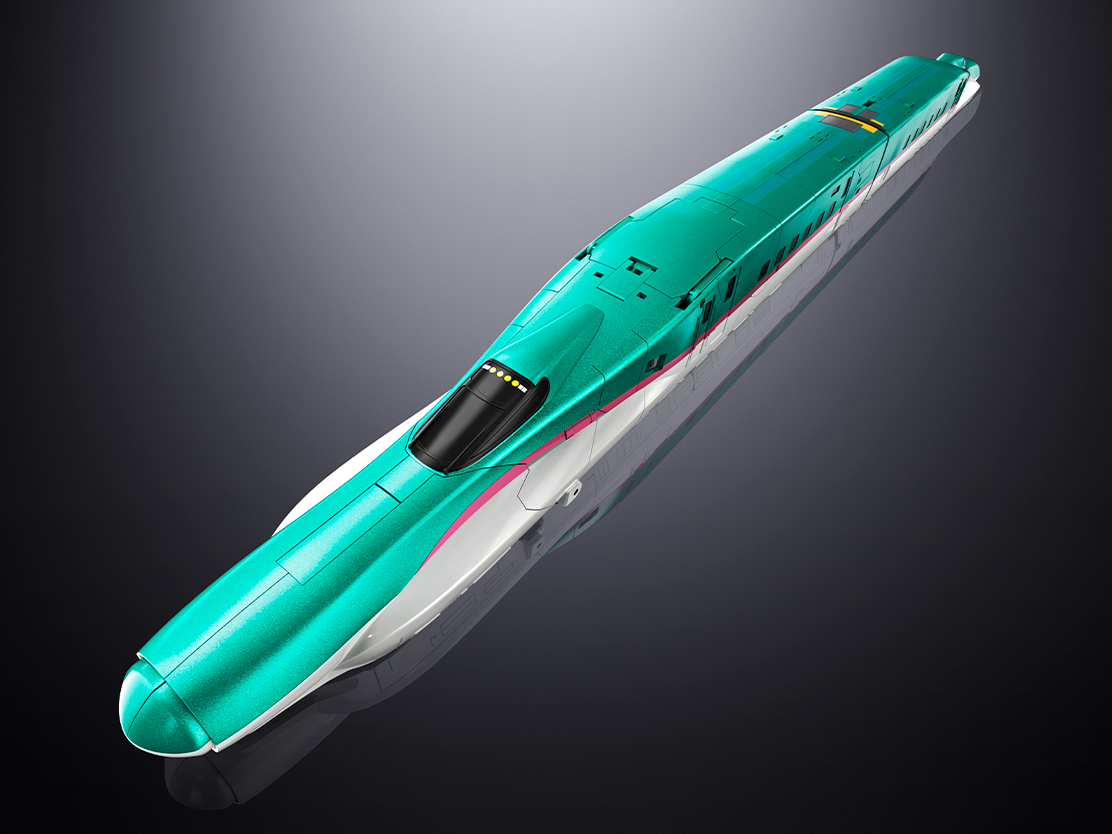 此次超合金魂推出了系列招牌的主角機「SHINKALION E5隼號」,以全高約 26 公分的合金可動規格呈現帥氣的造型、無剩餘零件的變形機構。在尚未變形的新幹線模式下包含先頭車、後尾車兩節頭車,細膩還原車體、前鼻的流線型設計,並透過色彩塗裝再現特徵的常盤綠、疾風粉紅、飛雲白等車體顏色,能搭配「新幹線超進化研究所」基地內造型的台座進行展示。