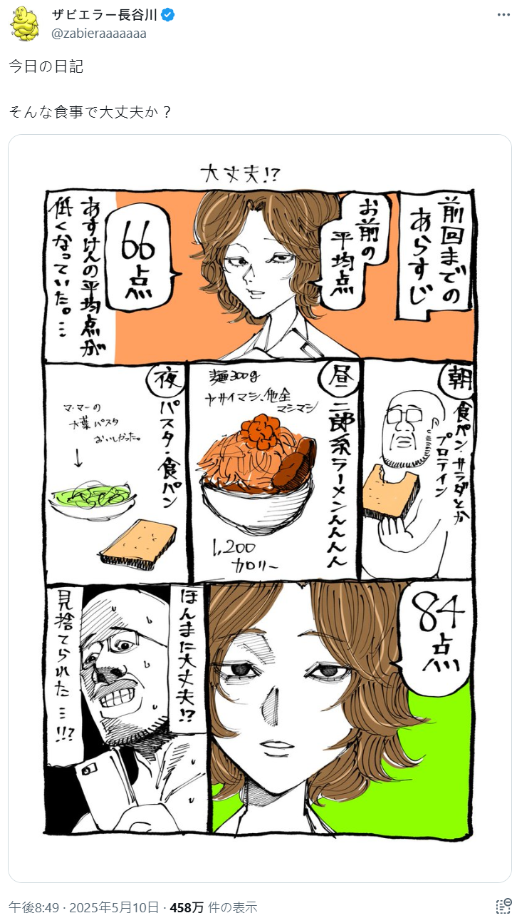 不過近期日本漫畫家ザビエラー長谷川他 Po 出一則漫畫,表示自己平常用「あすけん」監測自己的每日飲食,平均就 66 分上下。沒想到某日早上吃三明治,午餐二郎拉麵,晚上吃義大利麵,居然獲得 84 分高分讓他不可置信。
