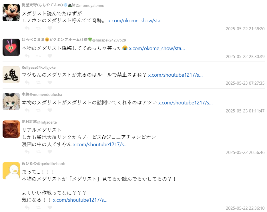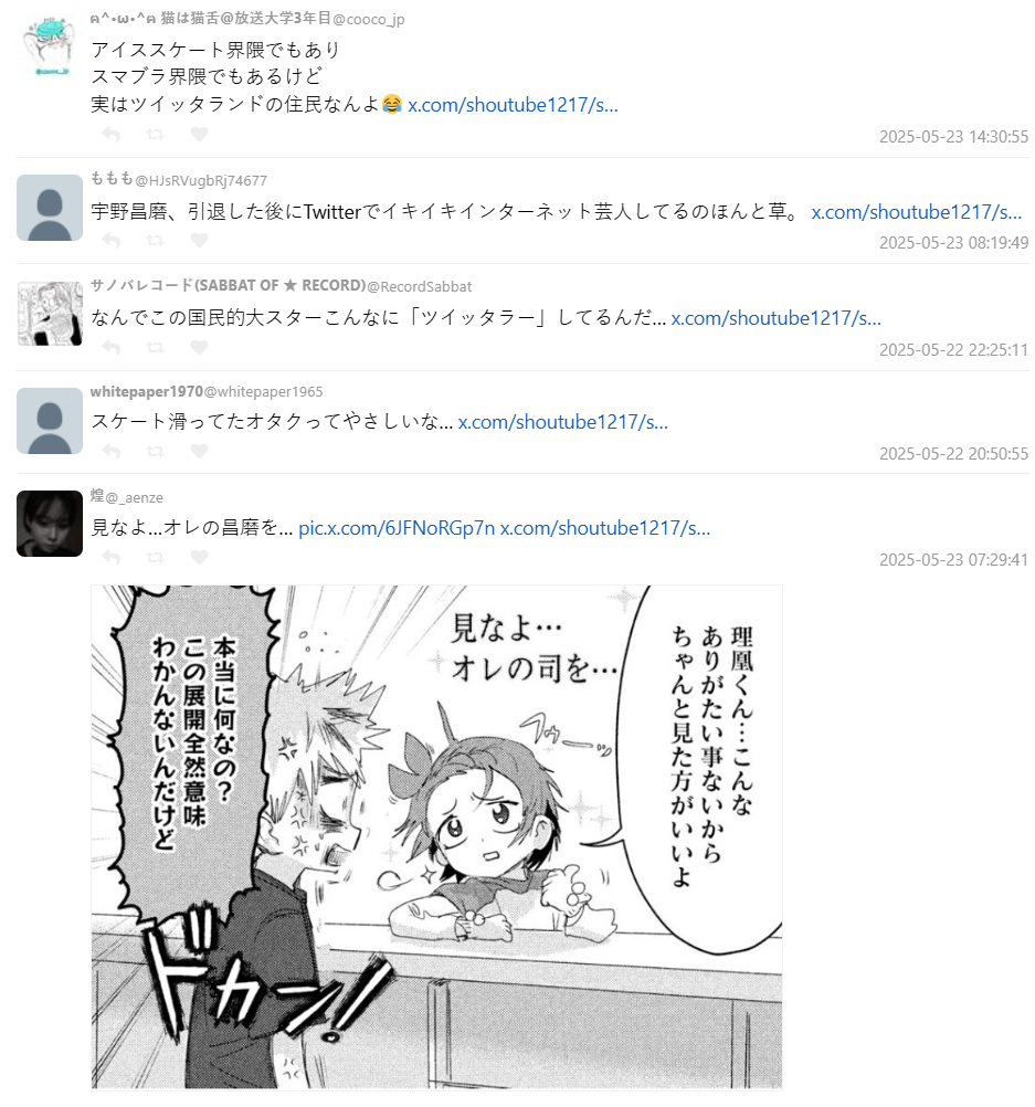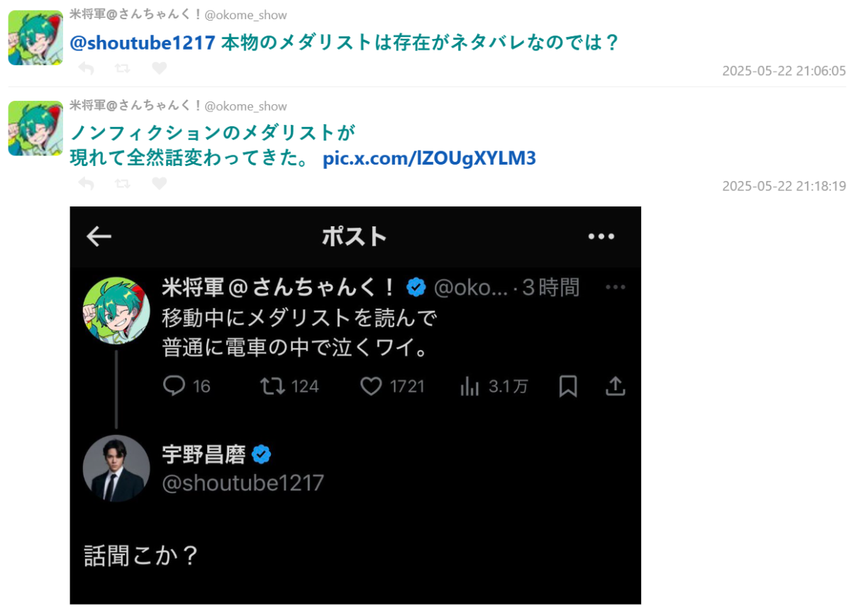 推主「米將軍」在 5 月 22 日傍晚發文寫道:「通勤中在看《金牌得主》,結果我在電車上直接哭出來」,表達對漫畫劇情的感動。數小時後,宇野昌磨竟現身回應:「是有多感動啦?」讓原本只是單純分享的貼文瞬間爆紅。