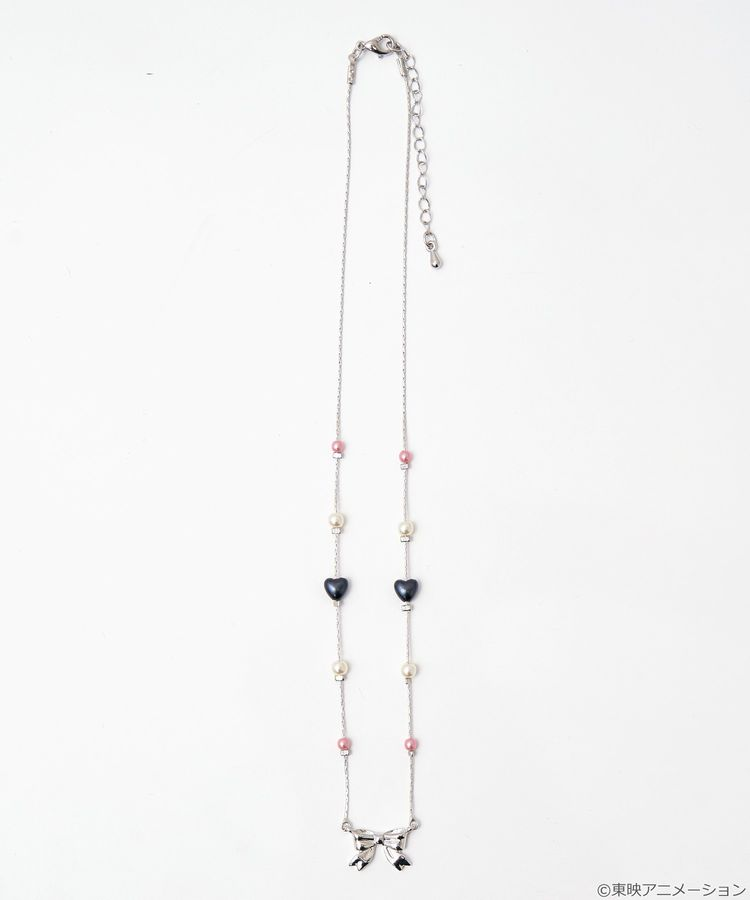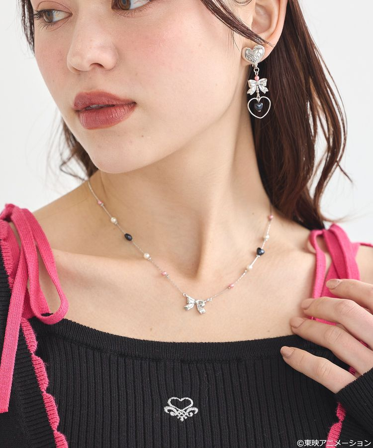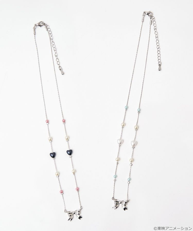 靈感來自角色服裝上的蝴蝶結,吊墜是原創設計的緞帶造型,再加上粉紅、淡藍、黑白心形珠點綴,很適合日常穿搭又帶點角色小巧思。