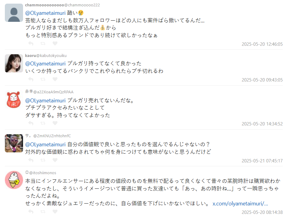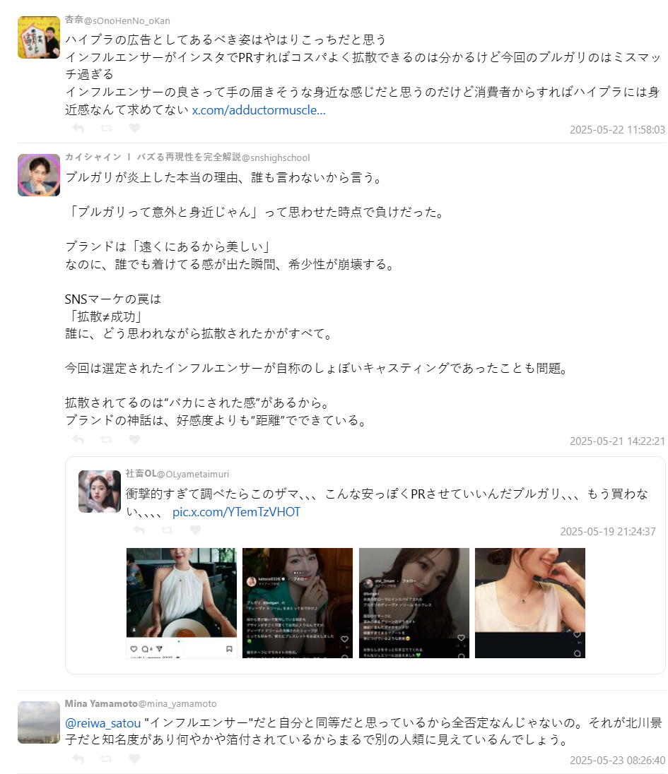 一名推特網友「社畜OL」率先發文表示,她因看到 BVLGARI 的宣傳貼文感到震驚,進一步查證後直言:「這也太廉價了吧……再也不會買了。」此言一出立刻引發大量轉推與回應,許多網友也紛紛附上來自 Instagram 的宣傳合作貼文截圖,批評品牌形象大受打擊。