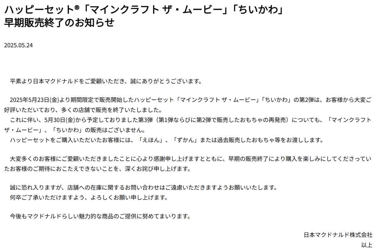 日本麥當勞於先前 ( 5/16 ) 推出的快樂兒童餐,包含《MINECRAFT麥塊電影》與《吉伊卡哇》系列玩具贈品,第一彈商品陷入搶購風潮,連前日 ( 5/23 ) 第二彈即使限制「每人限購四組」,也迅速賣光光。