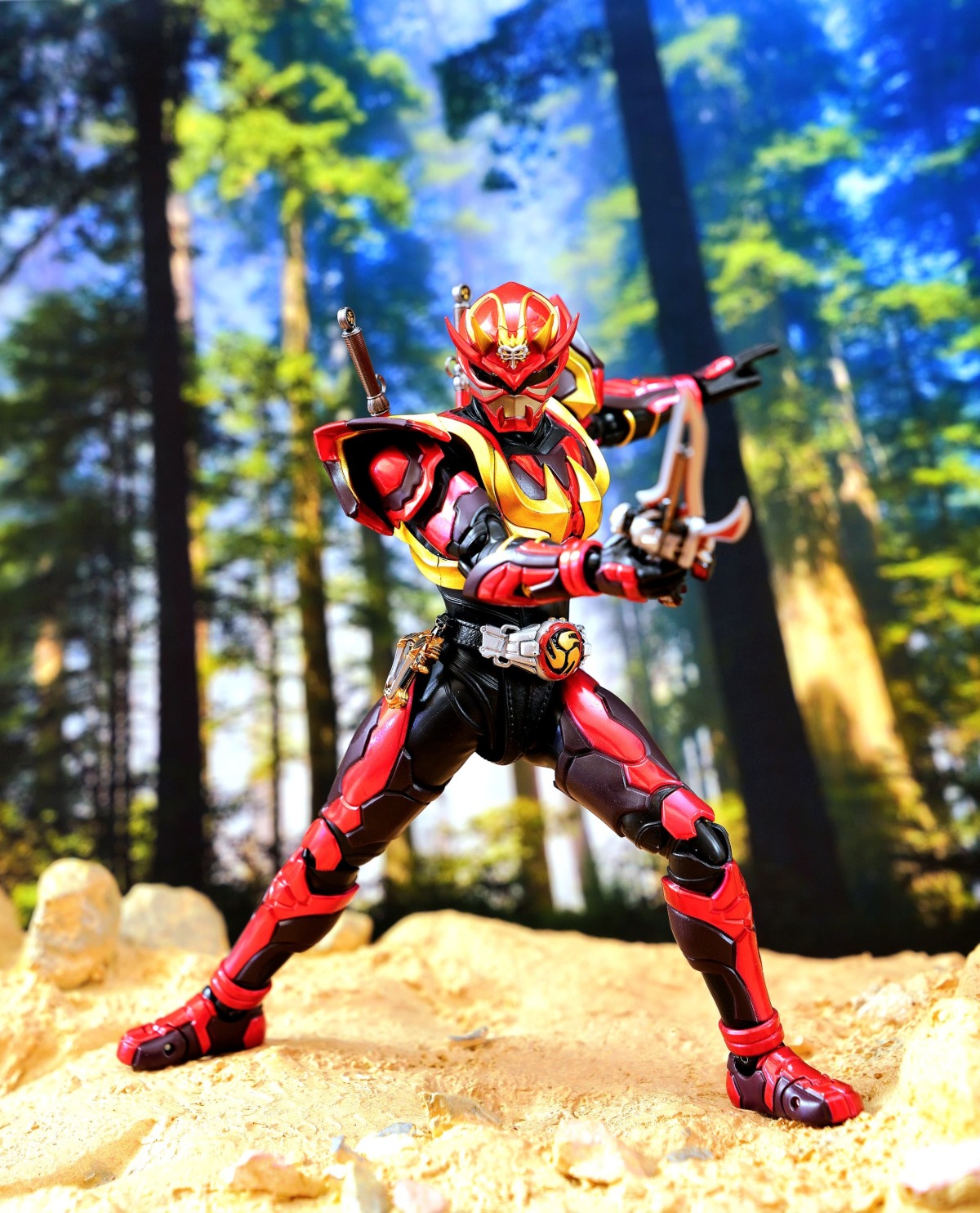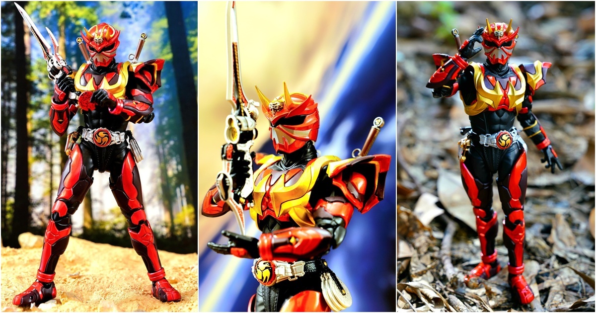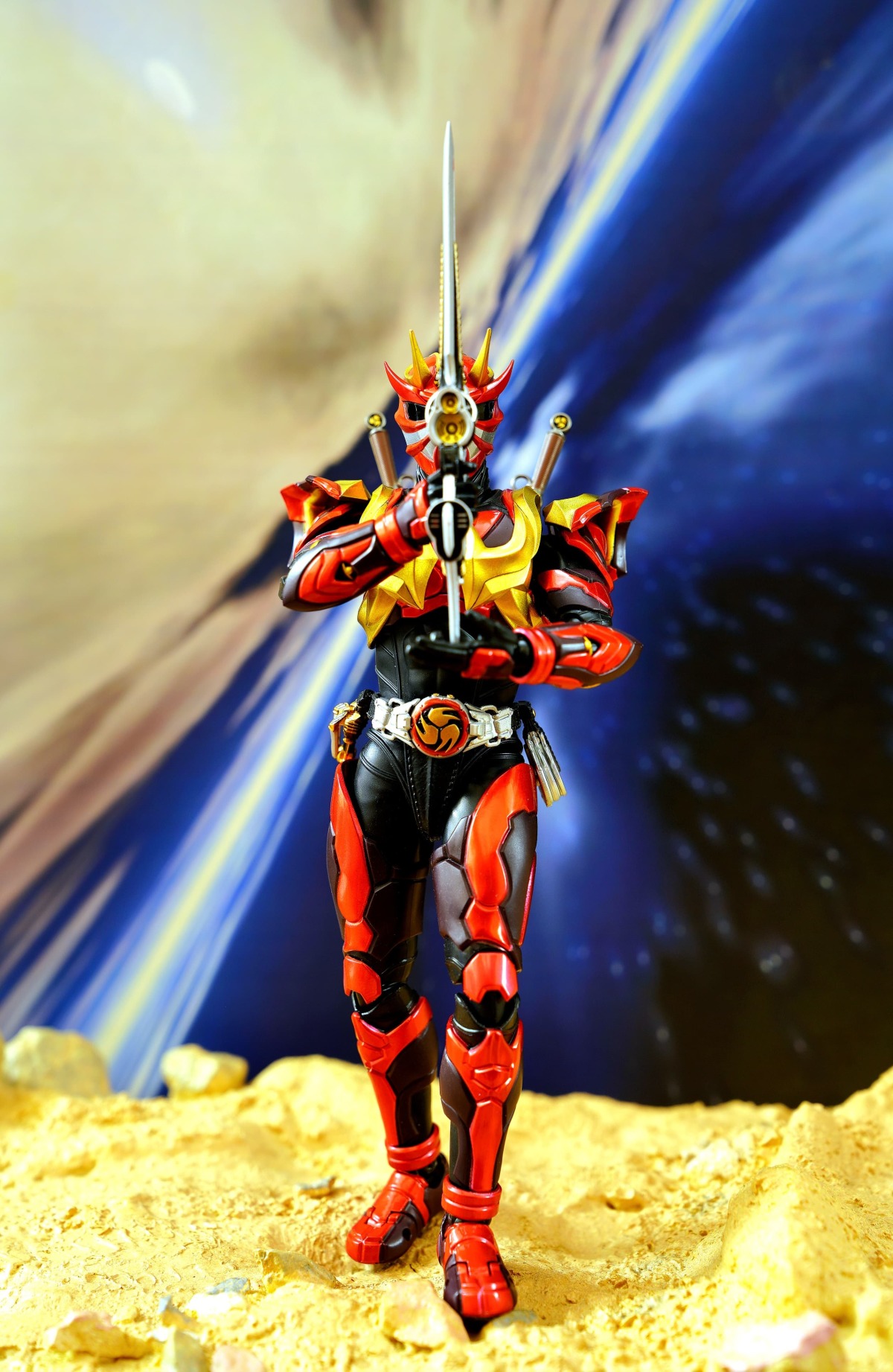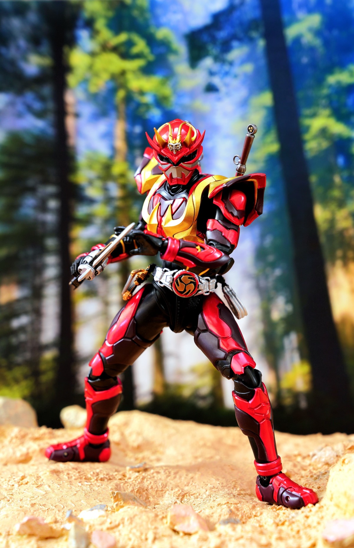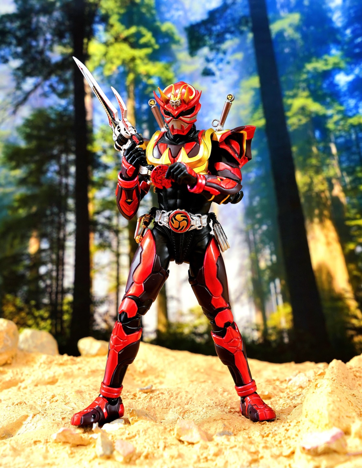 「裝甲響鬼」全身以紅、黑、金色為主。全高:約145mm,是使用音撃増幅劍·裝甲聲刃變身的形態,本次的可動人偶透過從骨骼開始雕塑,一點一點由肌肉再向外雕塑至服裝的真骨彫技法打造出這個響鬼最終形態。