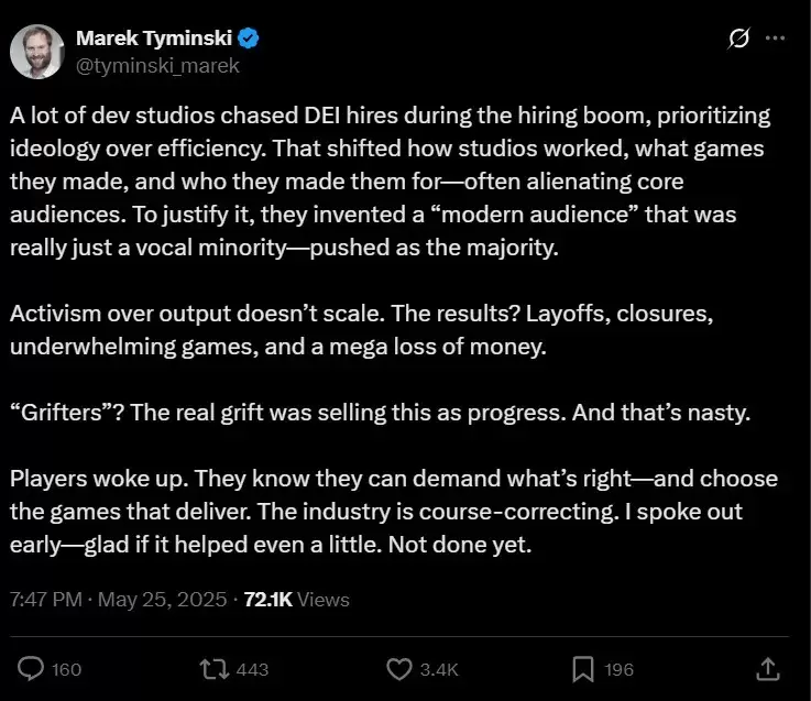 「玩家已經醒了,他們知道自己有權選擇真正值得的遊戲,而產業也終於開始聽進去。」Tyminski 在貼文中寫道。他強調,像《光與影:33號遠征隊》(Clair Obscur: Expedition 33)與《墮落之王》(Lords of the Fallen)等作品的成功,證明了不需要依賴 DEI 理念也能創造出色內容。