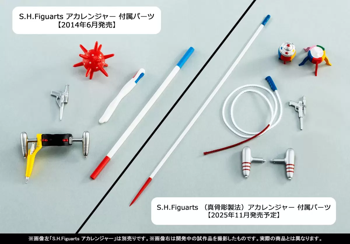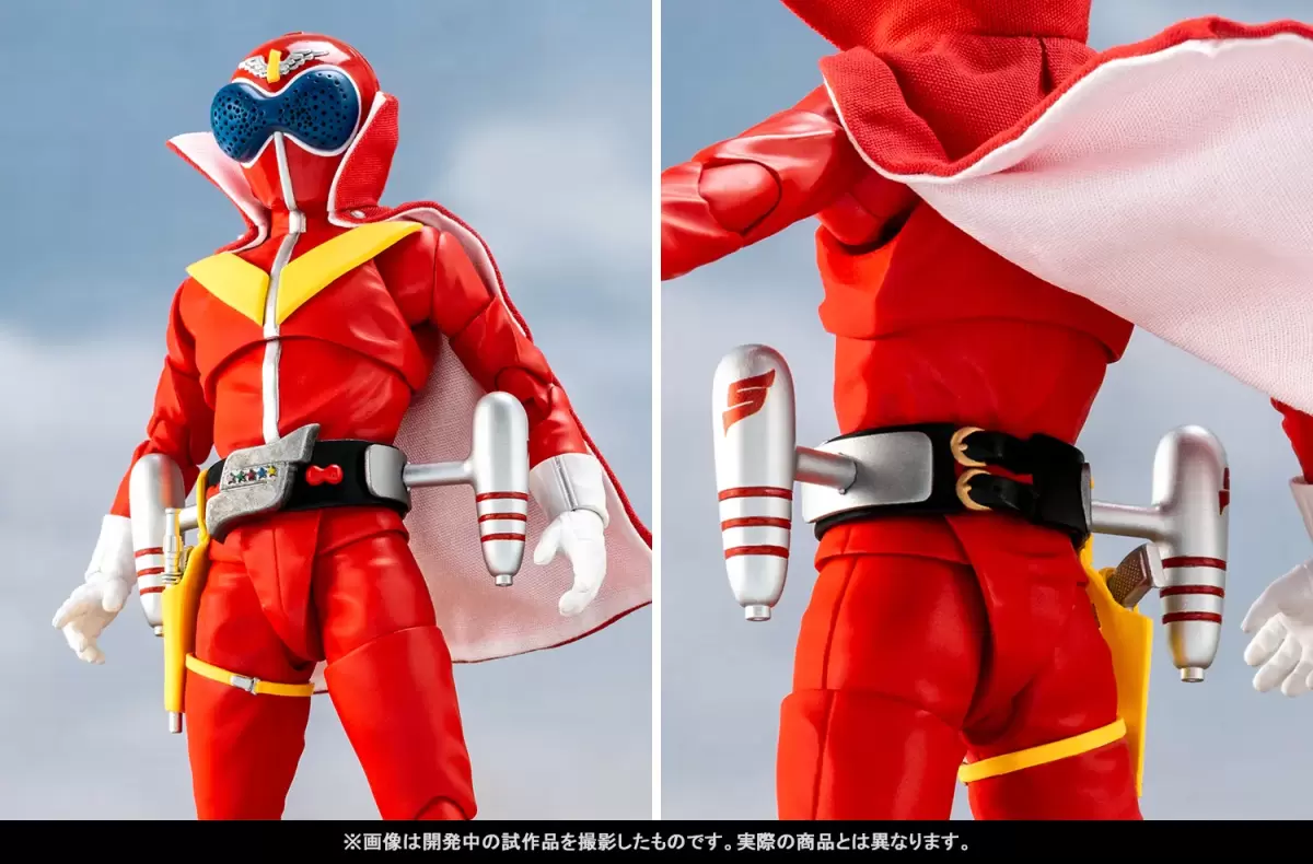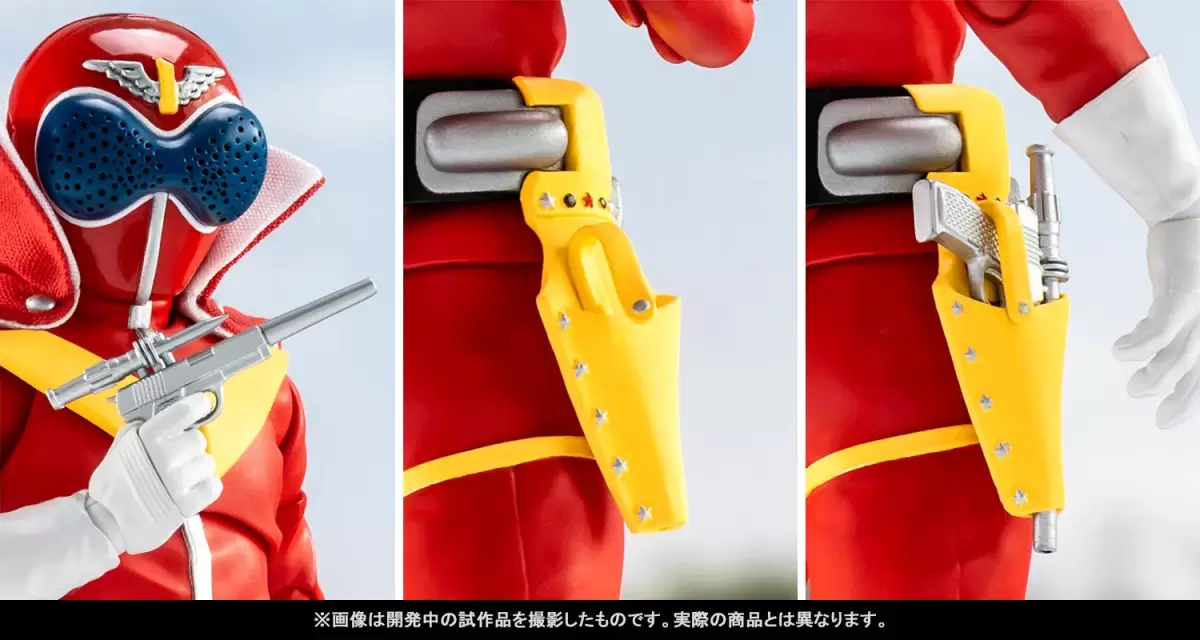 配件造型相較 S.H.Figuarts 版也更加進化,腰間兩側的「小型火箭推進器」無需替換整個腰帶就能直接加裝。收納「銀色手槍」的槍套能夠再現有 / 收納手槍的狀態。「赤紅鞭」使用可調整形狀的繩索零件製作,並附上尺寸相當還原的長槍形態。