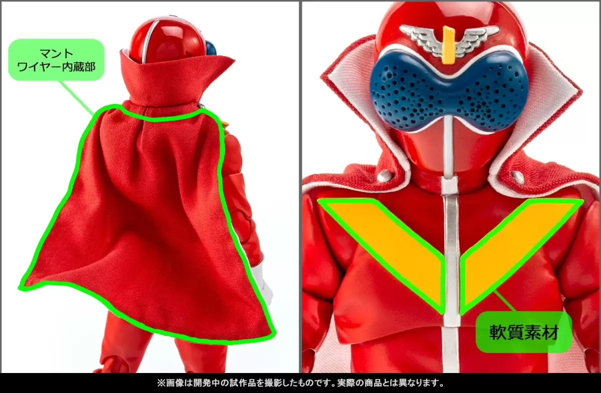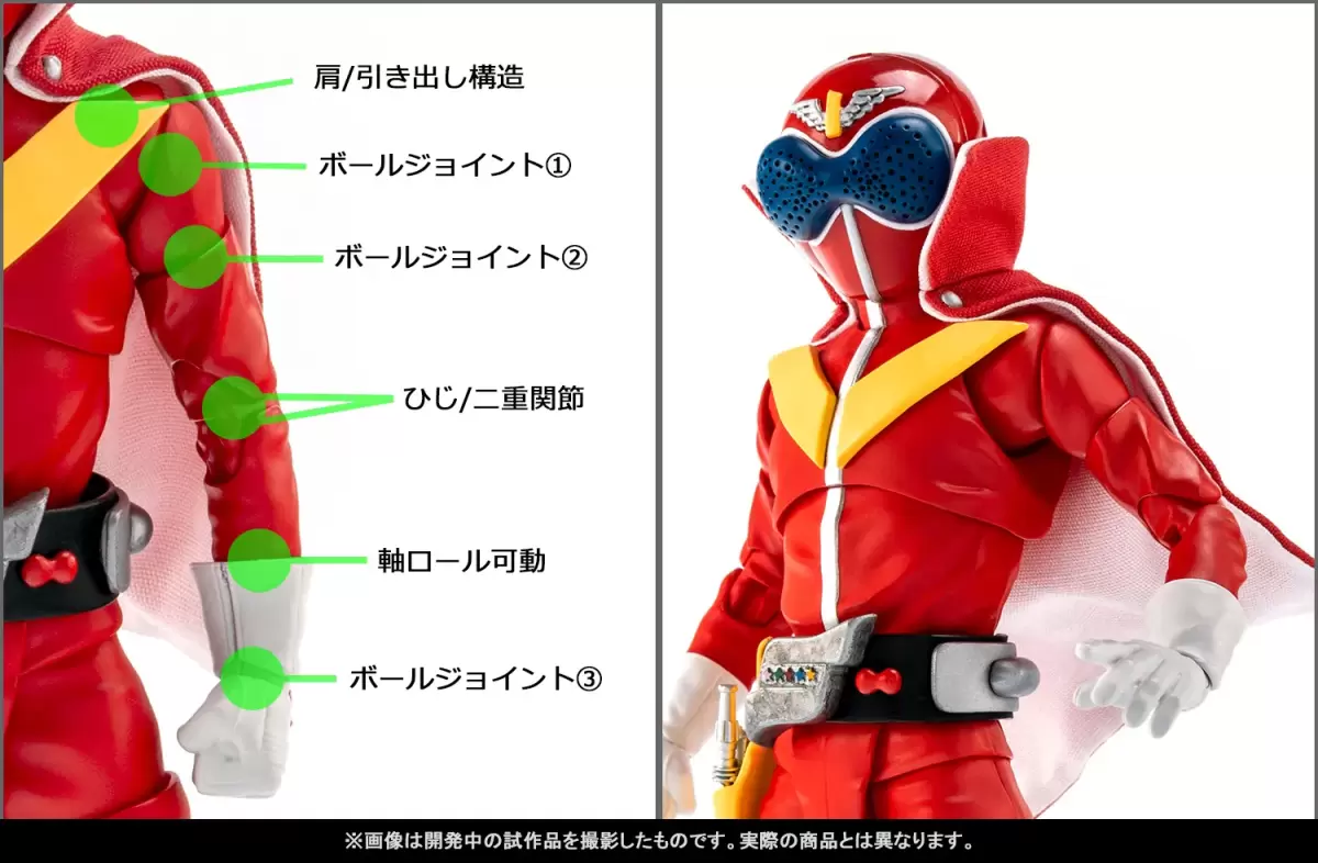 「S.H.Figuarts(真骨彫製法)赤連者」由原型師長汐響擔任原型製作,素體從骨骼、肌肉、戲服造型逐步雕塑而成,最後進行可動分割與關節設計,製作成全高約 14.5 公分的可動人偶。整體造型相比 2014 年推出的 S.H.Figuarts 版本擁有更貼近真人的體格、更加接近劇中戲服的細節造型,同時全身可動設計更加進化。