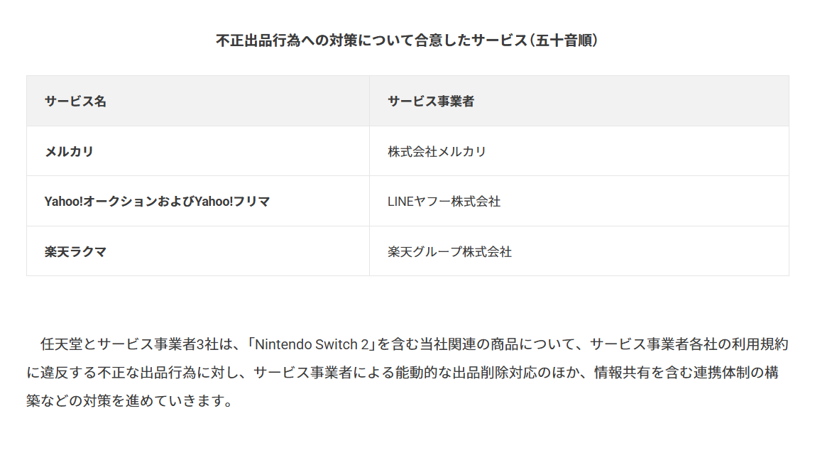 這三家也是日本算是最常見的拍賣網站,任天堂和上述三家平台業者已達成共識,對於像是「Nintendo Switch 2」這類任天堂旗下商品的違規上架行為,將共同展開防制措施,包括:由平台主動刪除違規商品的上架、任天堂與平台之間建立資訊共享的合作機制以及強化違規查核的聯防體系等行動。
